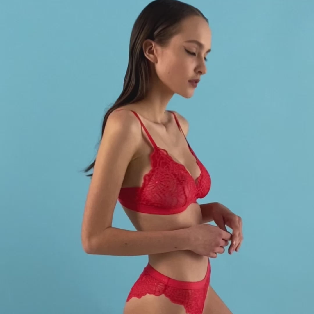 Nokaya modern red lace image bralette with logo elastic close-up front view.