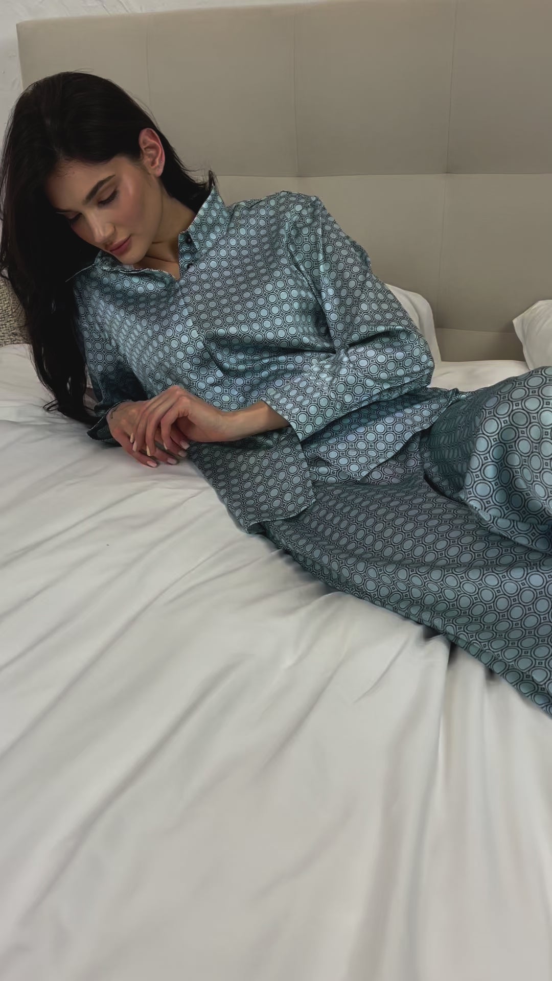 Pyjama Set is offered as a complete ensemble, featuring a calming "Cooling Spray" shade with a subtle graphic print that evokes balance and relaxation; it features contrasting, hand-worked fudge silk piping.